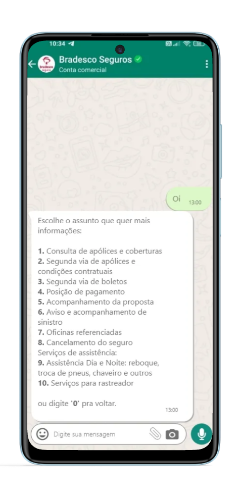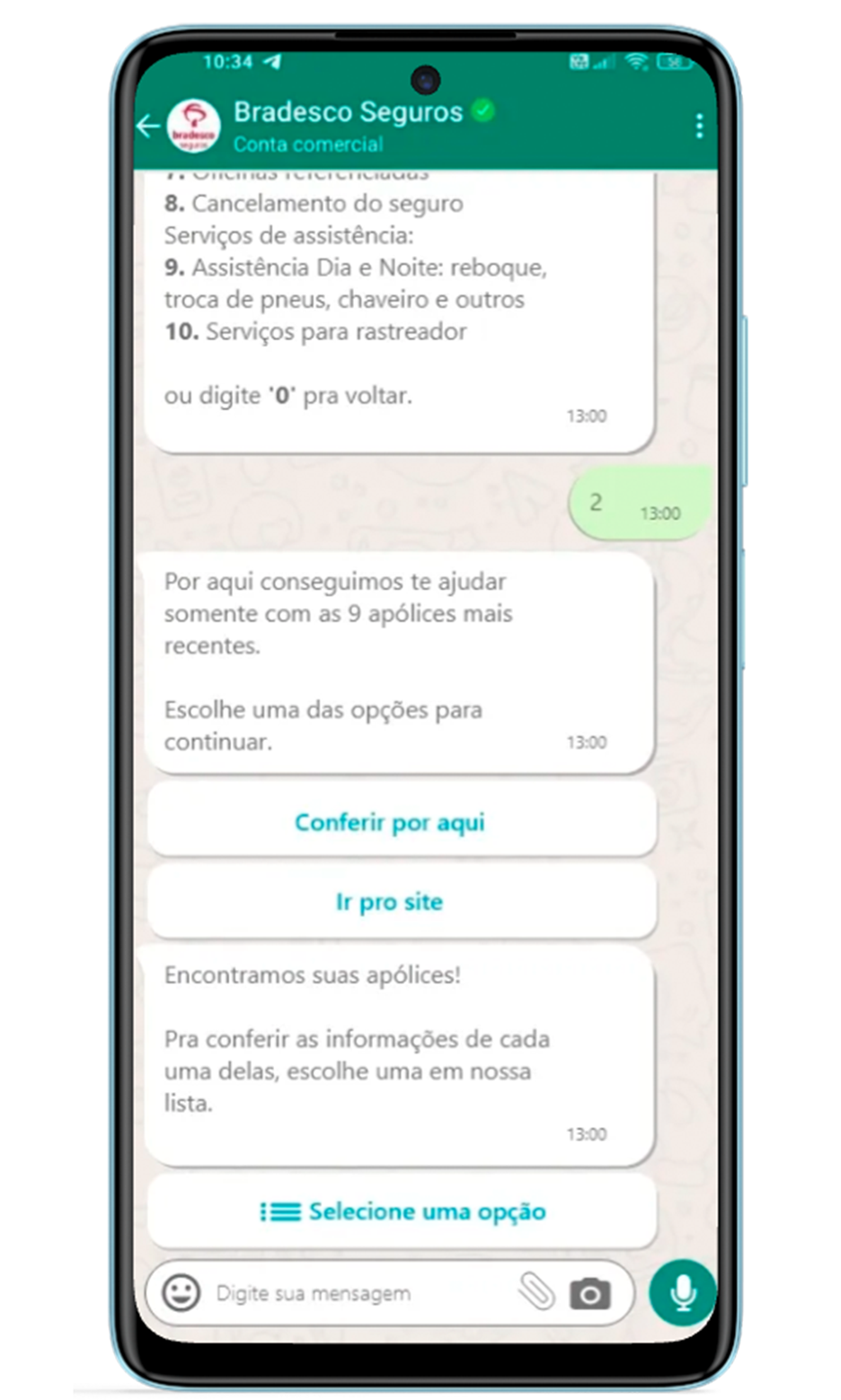 Dessa maneira, assim como no case sobre a rede referenciada, o serviço automatizado de 2° via de apólice foi lançado no WhatsApp Bradesco Seguros, significando um grande passo rumo a melhor experiência do usuário.