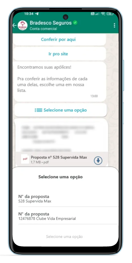 Conferir por aqui: nessa opção o usuário recebe as apólices encontradas de forma automatizada pelo WhatsApp.