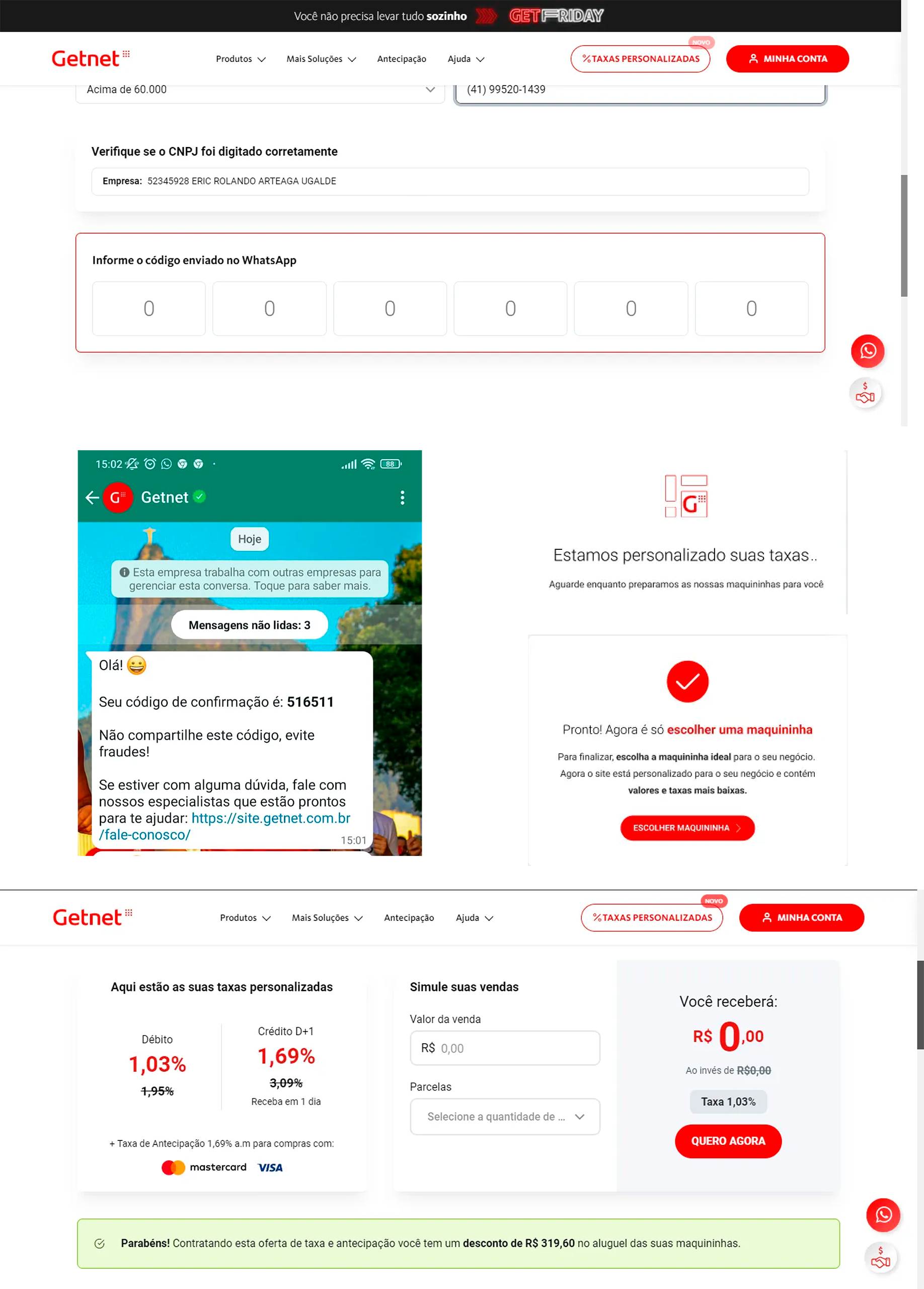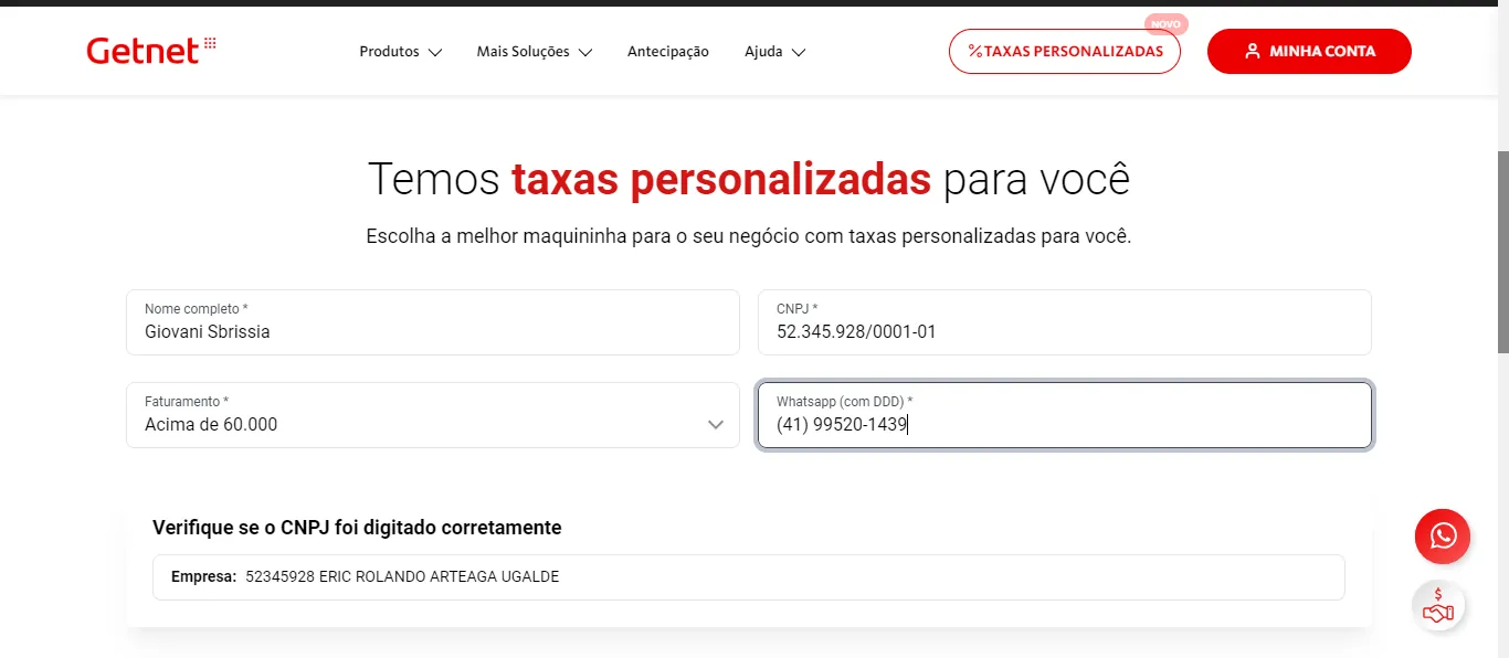 Por fim, o usuário receberá esta mensagem que o site está personalizado com as taxas ideais para o CNPJ do negócio apresentado.