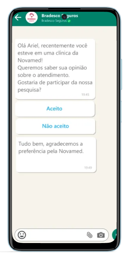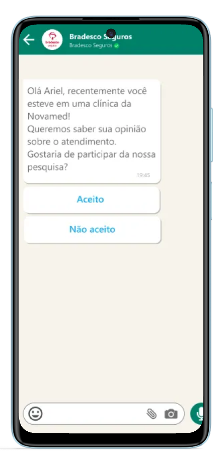 O objetivo desse fluxo é muito simples! Uma vez que o paciente tenha visitado uma clínica da Novamed e aceito receber mensagens da Bradesco Seguros no WhatsApp, ele receberá uma mensagem ativa, na qual será convidado a realizar uma pesquisa de satisfação de seu atendimento, como na imagem ao lado: